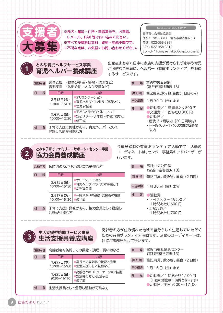 講座の参加者募集します(子育て支援・高齢者支援) 2025.12.22 育児ヘルパー養成講座、協力会員養成講座、生活支援員養成講座の参加者を募集中です。 ※氏名・年齢・住所・電話番号を、お電話、Eメール、FAX等でお申込みください。 ※すべて受講料は無料、資格・年齢不問です。 ※不明な点は、お気軽にお問い合わせください。 『地域福祉フォーラム2025』開催いたしました 前の記事 社協だより2026年1月号(No.241)を掲載致しました 次の記事